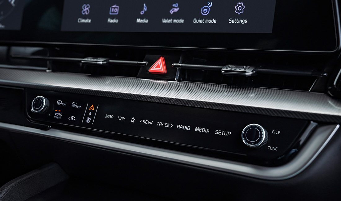 Damit dich nichts beim Fahren ablenkt, haben wir die Zentralkonsole so bedienfreundlich und übersichtlich wie möglich gestaltet. In der Mitte unterhalb der Lüftungsauslässe befindet sich der zentrale One-Touch-Regler. Damit kannst du leicht zwischen Klimaanlage und Infotainment-System hin- und herwechseln. Du brauchst dich nicht durch lange Menüs zu klicken, sondern kannst intuitiv direkt die gewünschten Funktionen aktivieren. Auch die Drehregler passen sich der gewünschten Einstellung an.